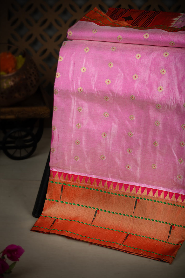 Varamahalakshmi Rose Pink & Gold and Red Paithani Buttis Saree