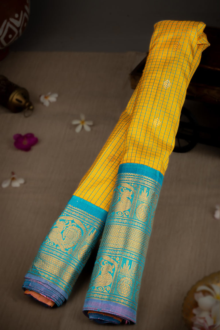 Varamahalakshmi Yellow & Sea Blue Gadwal Checks And Buttis Saree