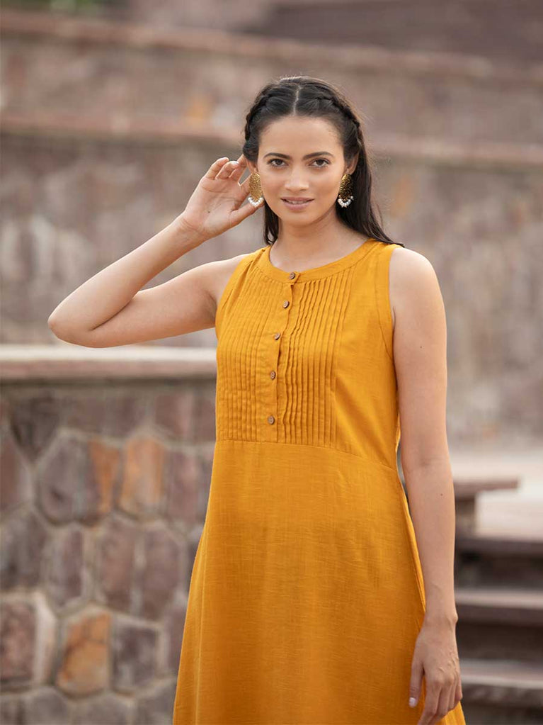 Mustard Yellow Sleeveless Cotton Pintuck Dress