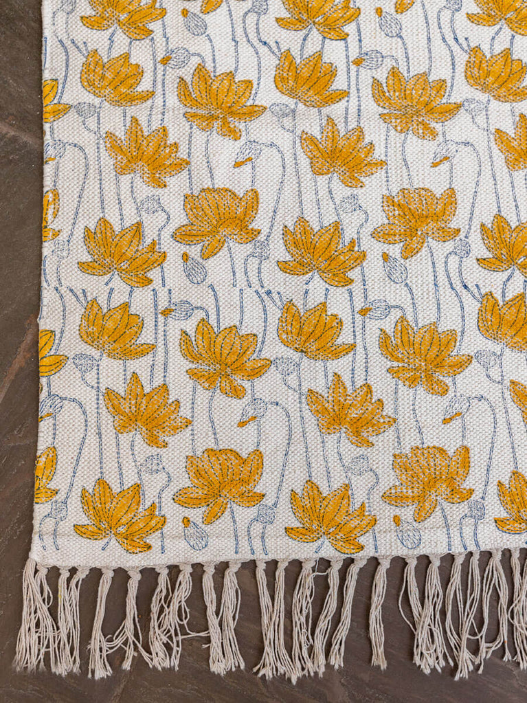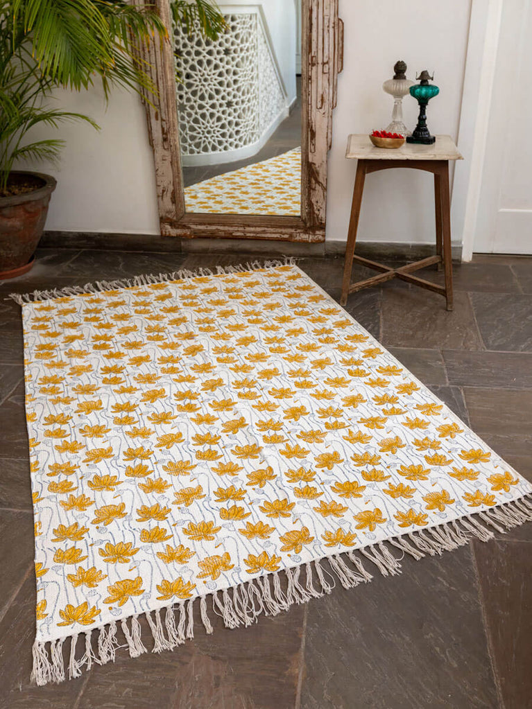Mustard Lotus Block Printed Cotton Dhurrie Rug