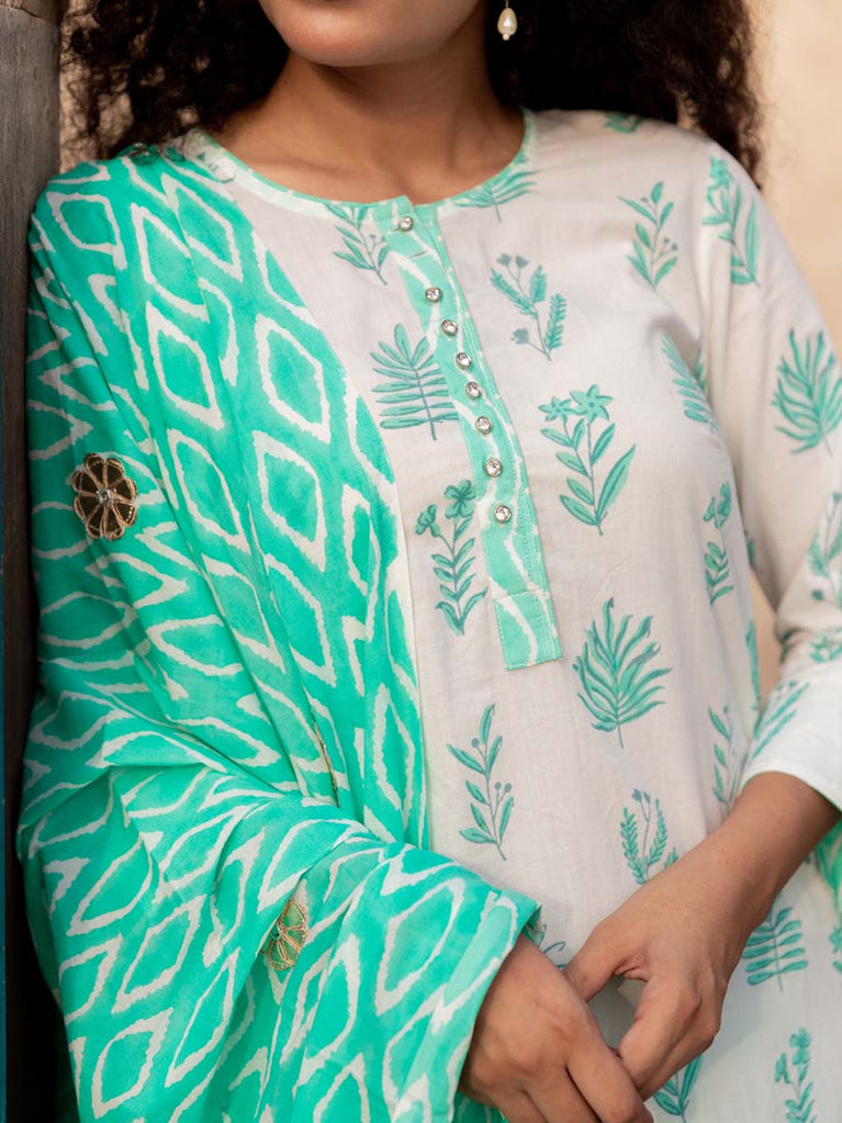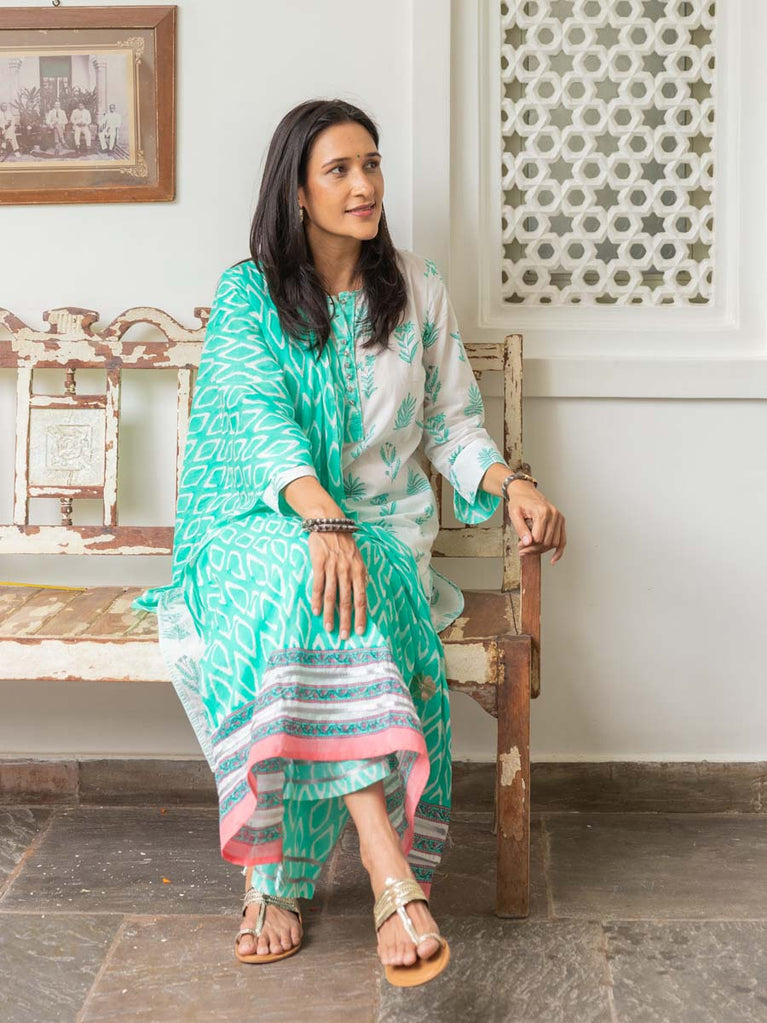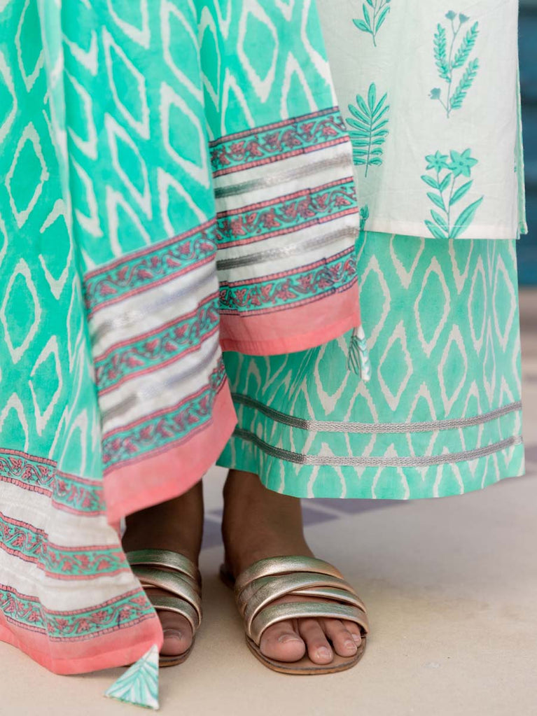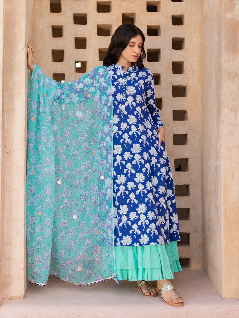Turquoise Ikat Block Printed Mulmul Dupatta