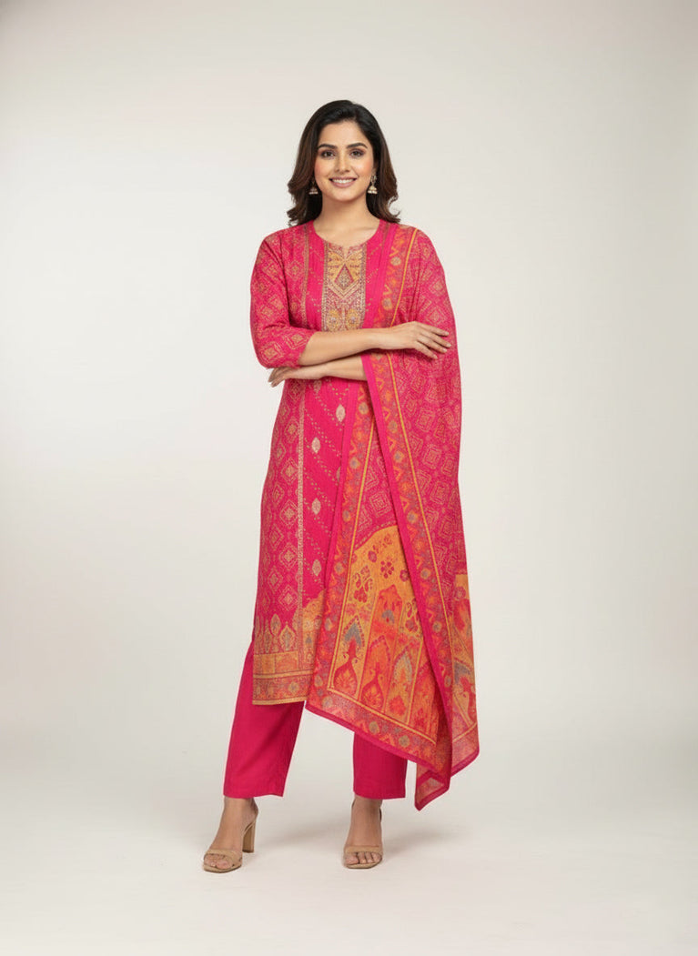 Elevate your ethnic wardrobe with this stunning magenta three-piece set crafted from luxurious dola silk. The vibrant digital print adds contemporary flair to traditional styling, making it perfect for festive occasions, celebrations, or everyday elegance. This versatile ensemble combines comfort with sophistication, allowing you to express your personal style with confidence. The rich magenta hue complements various skin tones beautifully, while the premium silk fabric ensures a graceful drape and lasting quality. Ideal for those who appreciate the perfect blend of modern design and timeless tradition.