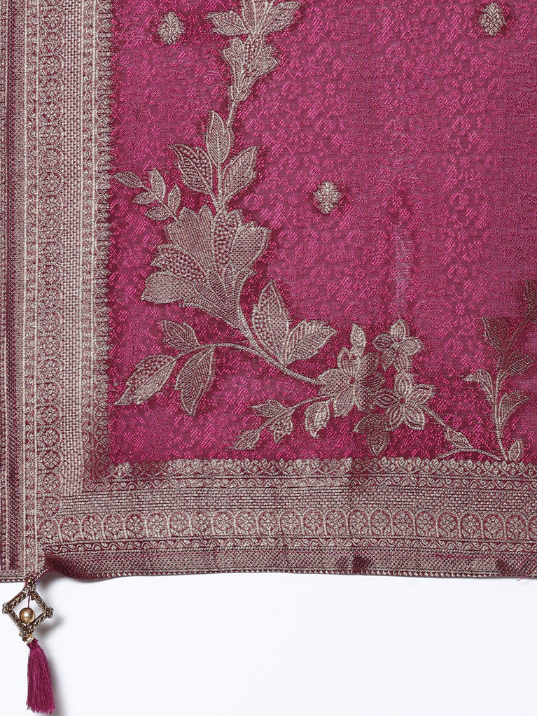 Elevate your wardrobe with this Magenta Tissue embroidered three-piece suit set. Crafted from lightweight tissue fabric, it offers a refined texture and graceful drape. The delicate embroidery adds an elegant touch, perfect for formal occasions. This set includes a beautifully embroidered kurta, matching bottoms, and a coordinating dupatta, combining comfort with timeless sophistication. Ideal for those seeking a poised and stylish ensemble.