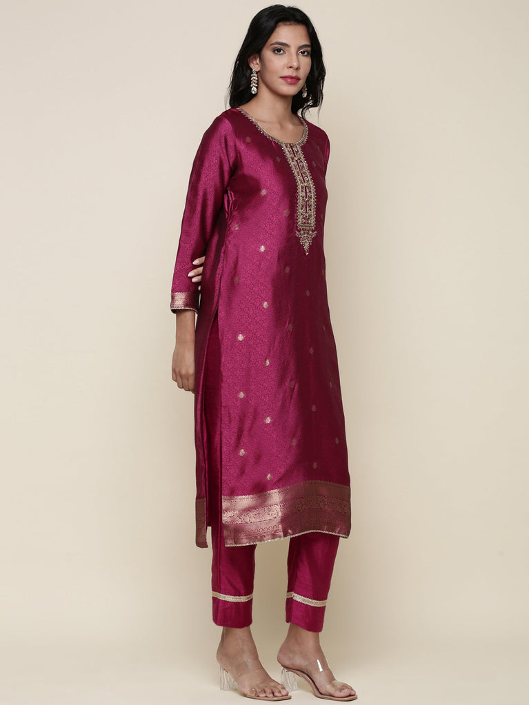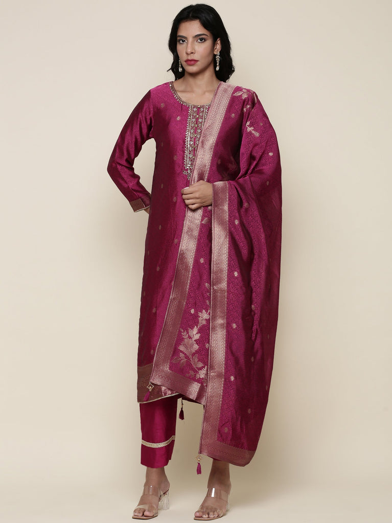 Elevate your wardrobe with this magenta silk three-piece set, expertly crafted with intricate embroidery that adds timeless elegance. The set features a finely detailed blouse and matching bottom, complemented by a contrasting dupatta that enhances the ensemble’s vibrant appeal. Perfect for festive occasions or formal events, this carefully designed outfit combines traditional artistry with luxurious fabric for a distinguished, sophisticated look.