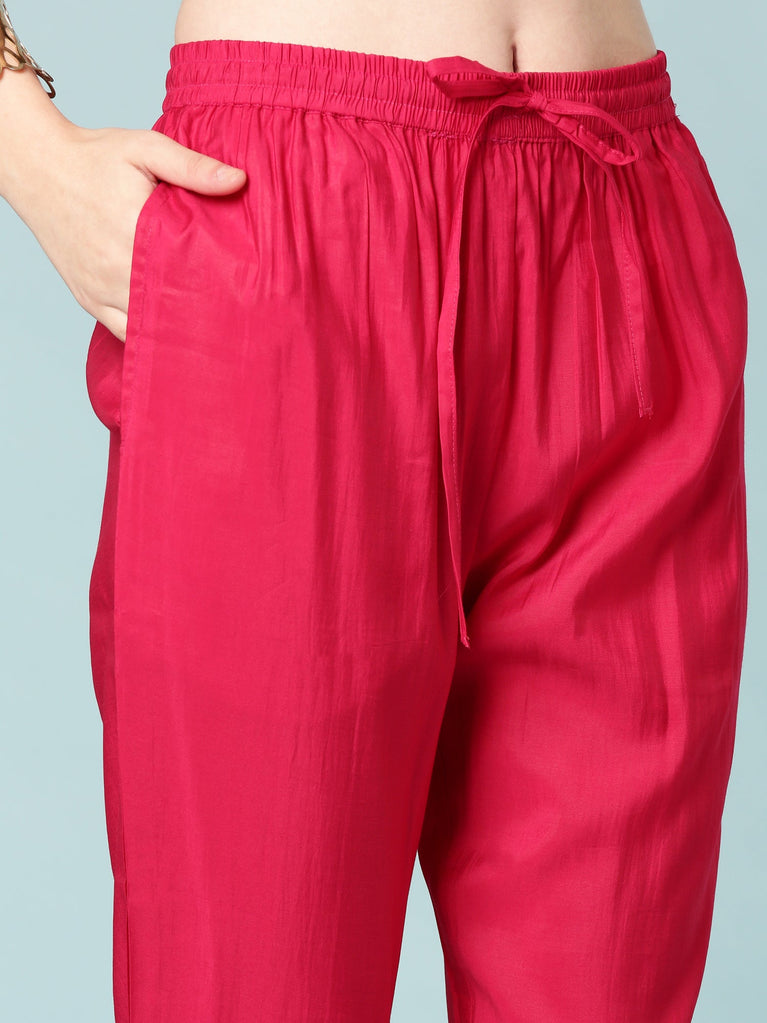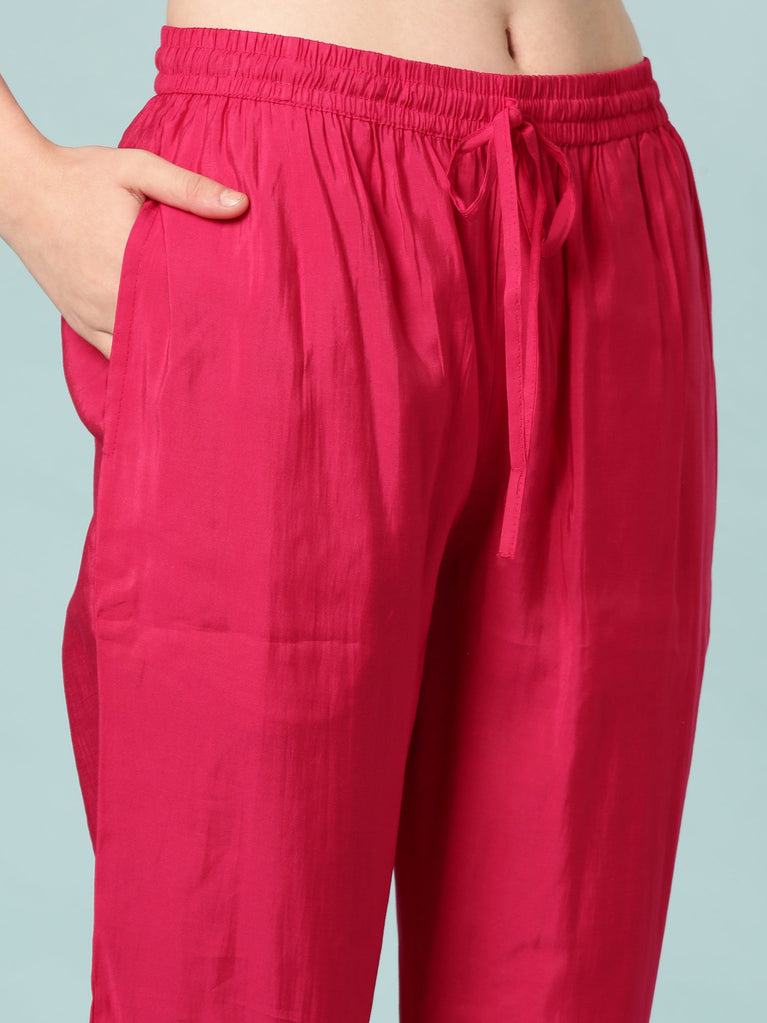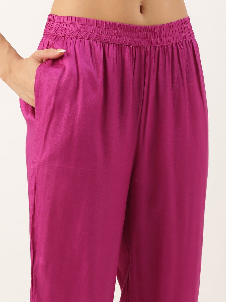 Elevate your ethnic wardrobe with this striking magenta crepe ensemble. The kurti features refined tailoring with a graceful silhouette, while the coordinating palazzo pants offer effortless comfort and movement. Crafted from quality crepe fabric, this set delivers a polished look perfect for festive occasions, celebrations, or everyday elegance. The rich magenta hue complements all skin tones, making it a versatile addition to your collection. Ideal for those who appreciate timeless style with contemporary appeal.