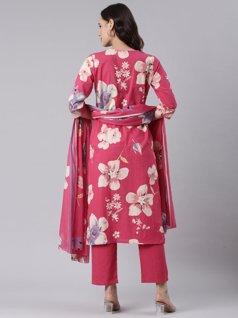 Experience vibrant style and comfort with this magenta cotton printed three-piece set. Crafted from breathable cotton, it ensures all-day freshness and softness against your skin. The rich magenta hue paired with delicate prints makes it perfect for casual outings or festive occasions, adding a pop of color to your wardrobe. This versatile set offers effortless coordination and enduring comfort, making it a must-have for those who value style and ease. Elevate your everyday look with this bright, breathable, and beautifully printed ensemble.