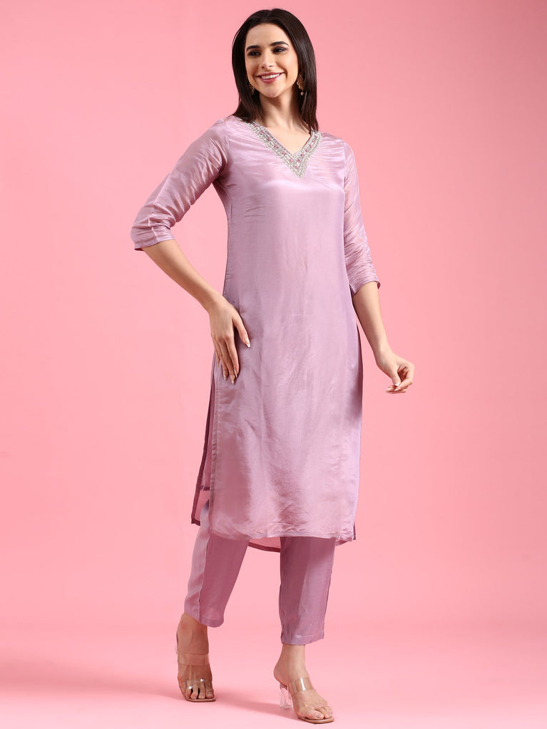 Elevate your elegance with this Lilac Tissue Hand Embroidery Three Piece Suit Set, featuring delicate hand-embroidered details that add refined texture and charm. Crafted from lightweight tissue fabric, it offers a graceful drape and comfortable wear. This ensemble includes a coordinating top, bottom, and matching dupatta, making it perfect for sophisticated occasions where understated luxury is desired.