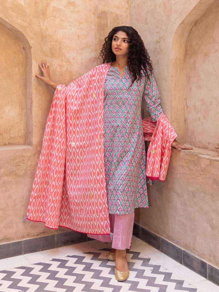 Pink Ikat Hand Block Printed Cotton Dupatta