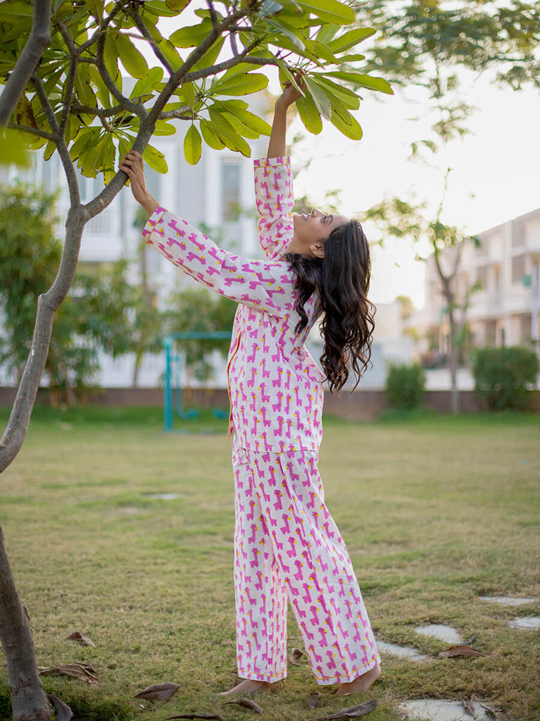 Pink Giraffe Block Printed Cotton Top & Pyjama Set