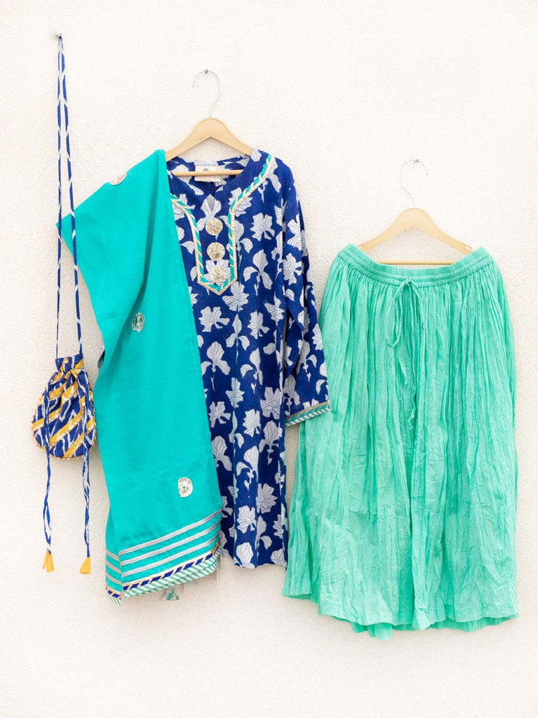 Set of 3 - Blue Sky Block Printed Kurta With Jacket