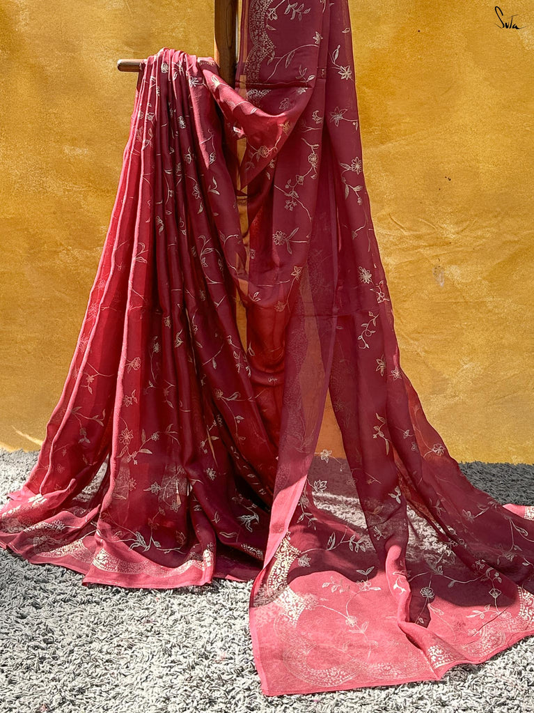 A delicate symphony of elegance, this light blue floral embroidered net saree is a masterpiece of craftsmanship. The intricate zari and sequin work along the border and pallu add a touch of opulence, while the lightweight net fabric ensures effortless draping. Perfect for festive occasions, weddings, or formal gatherings, this saree exudes charm and sophistication. The pastel hue complements a variety of skin tones, making it a versatile addition to your ethnic wardrobe. Pair it with statement jewelry and heels for a complete look. Comes with an unstitched blouse piece for customization.