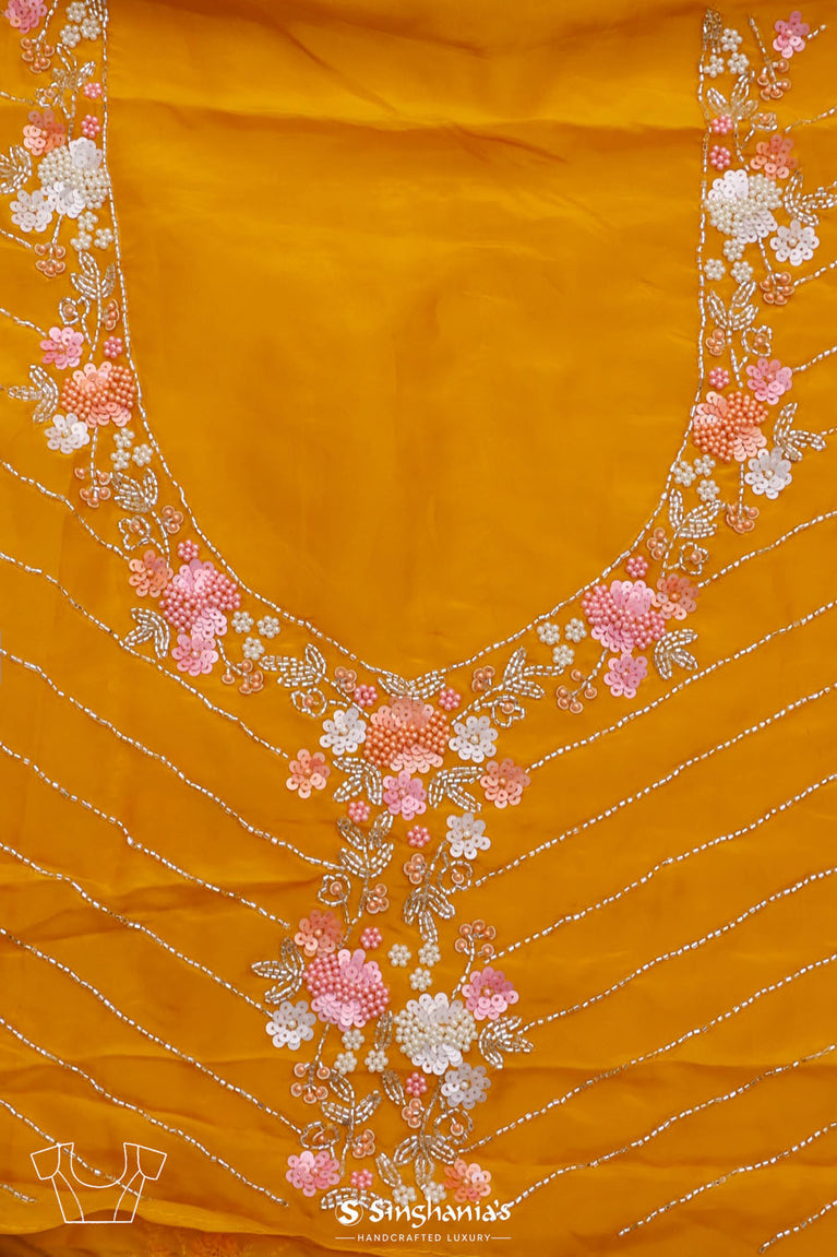 A beautiful amber yellow organza designer saree with floral jaali design embroidery all over the body. Accentuated in sequins and glass beads, with minimal scalloped border edge, that adds to the whole look - this saree is suitable for festive and wedding occasions.