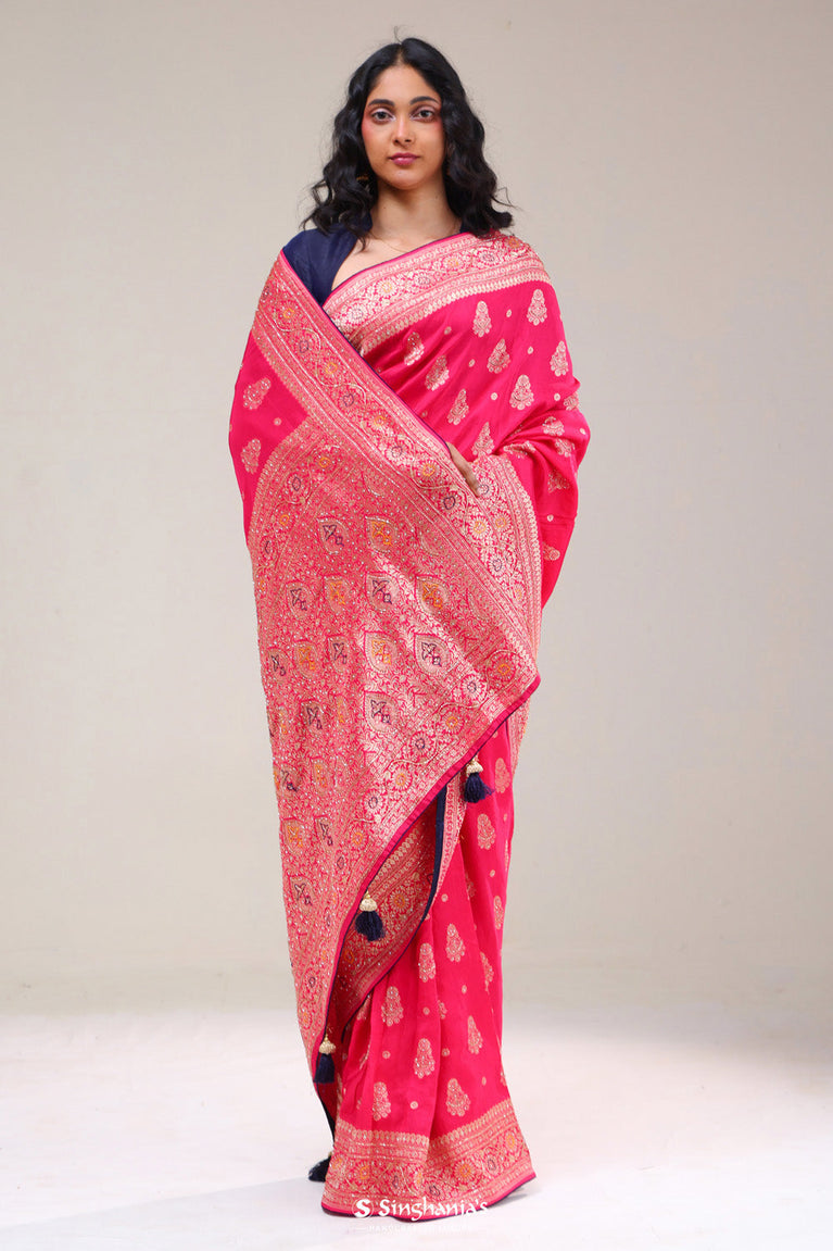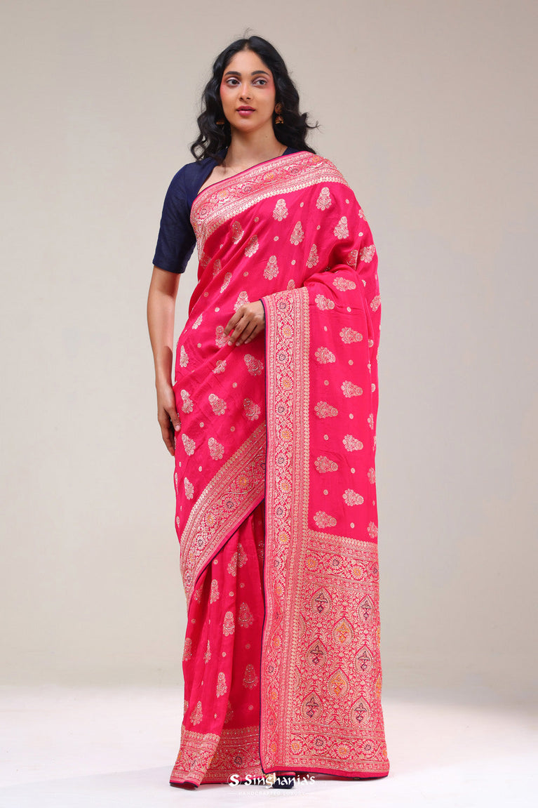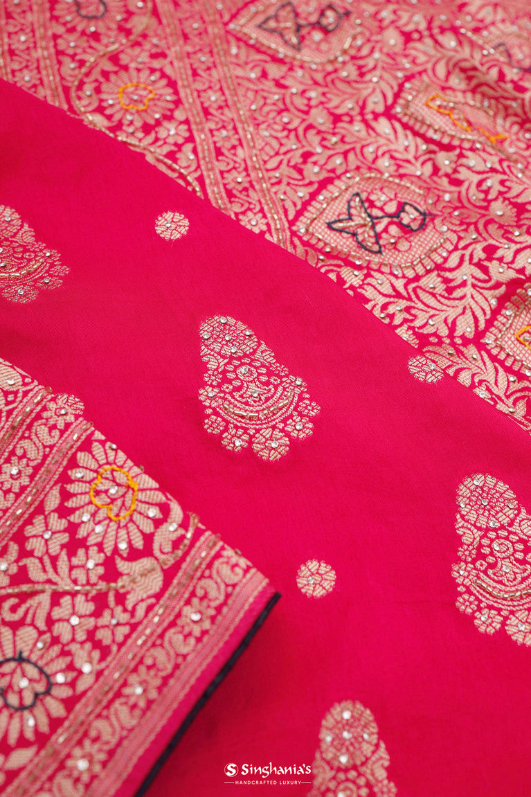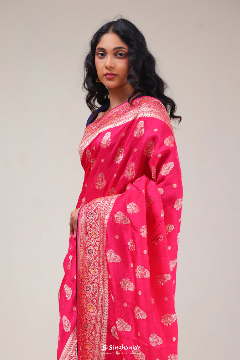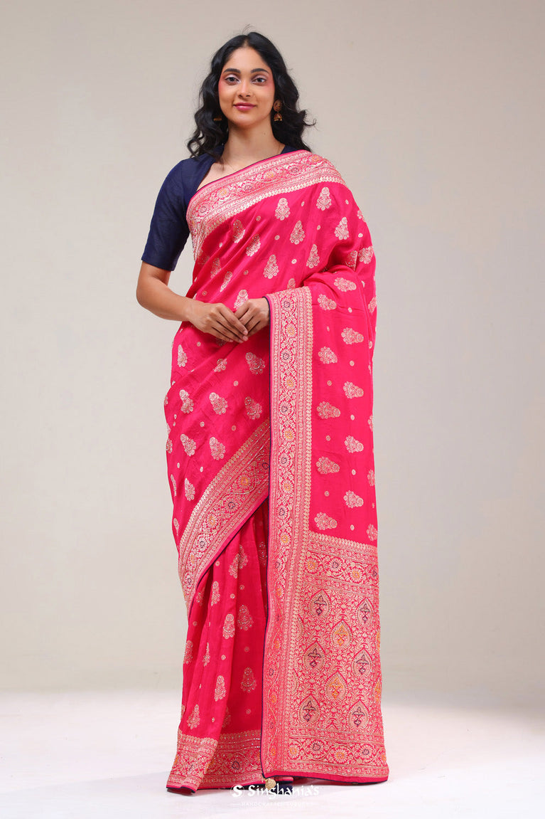 A richly amaranth pink saree with a silk base, which features gold zari woven floral butta pattern on the body and border. Accentuated with multi-colour thread, glass beads and stone embroidery, that adds to the whole look. Suitable for festive wear, and wedding parties.