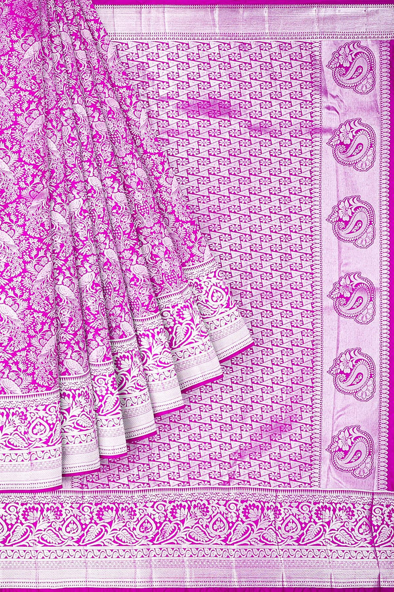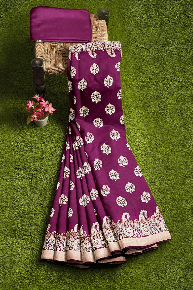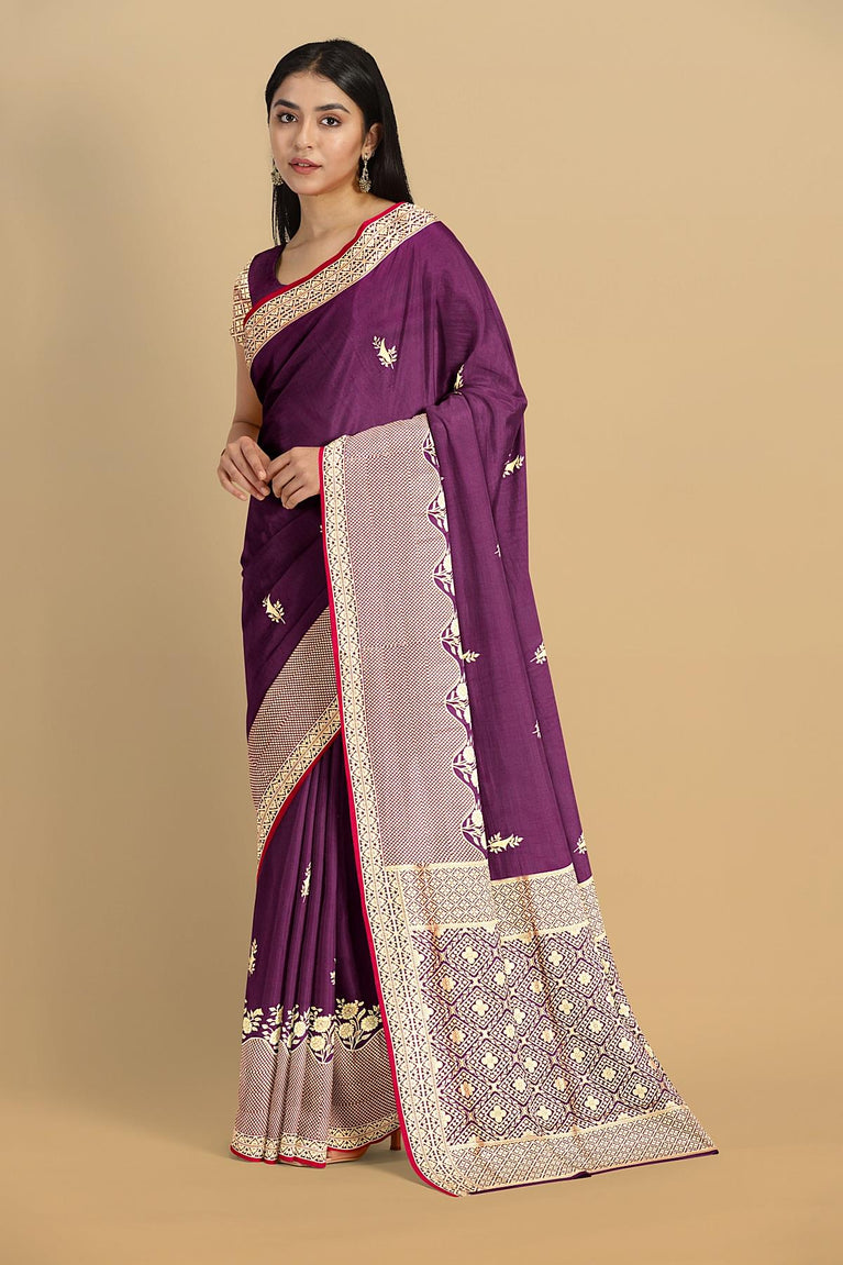 MAGENTA and SILVER FLORAL JAAL SILK BLEND Saree with SEMI PATTU