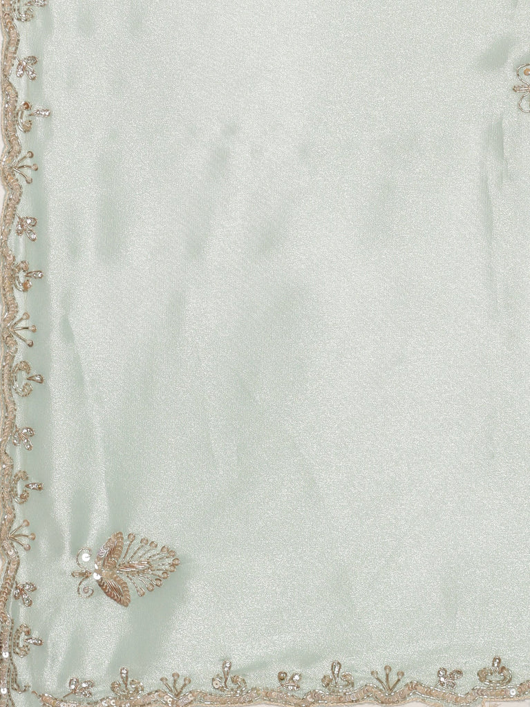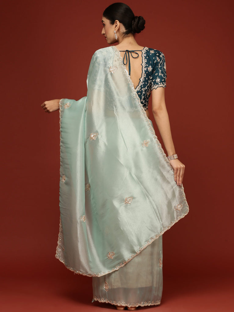 Blue Jimmy satin tissue saree work pearls & sequins embroidery with ready made blouse