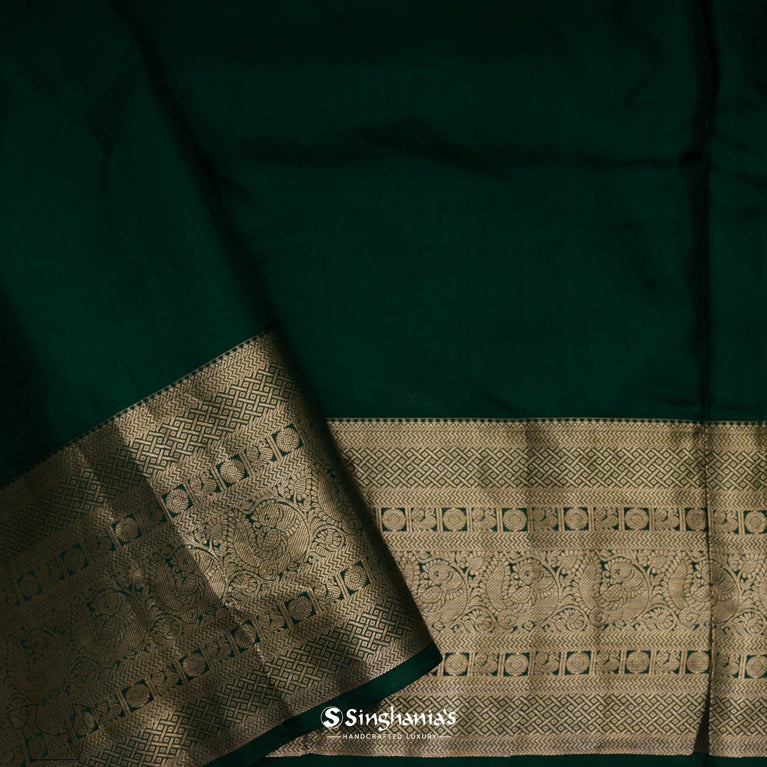 A luminous bright gold kanjivaram silk saree where the body features delicate floral jaal weaving in fine gold zari, complemented by a rich pallu displaying classical peacock and kaddi patterns. The broad border adds a fresh dimension to this timeless piece.