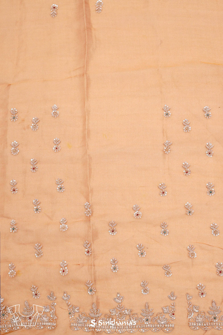A delicate brown gold saree with a tissue base, which features floral butti embroidered pattern. Added with intricately embroidered floral scalloped border, crafted with sequins and glass beads. Suitable for festive wear, and wedding parties.