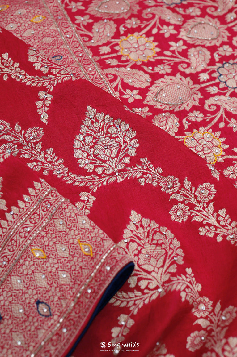 A richly cardinals red saree with a silk base, which features gold zari woven floral jaal pattern on the body and border. Accentuated with multi-colour thread, glass beads and stone embroidery, that adds to the whole look. Suitable for festive wear, and wedding parties.