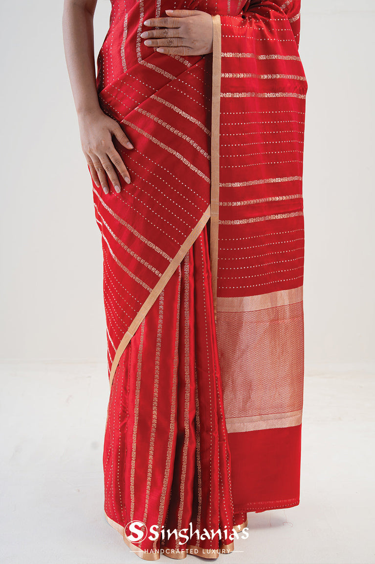 A cardinals red banarasi saree with a satin base, designed with gold zari multi-stripes pattern all over body. The saree features simple gold zari edging and small pallu that accentuates the look. An ideal choice for weddings and festivals.