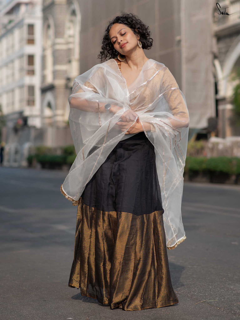 Along with the overlay, Su, the model, is wearing Crape Mrytle Bawns as an underlay. You could find the same here https://suta.in/products/crape-mrytle-bawns-1