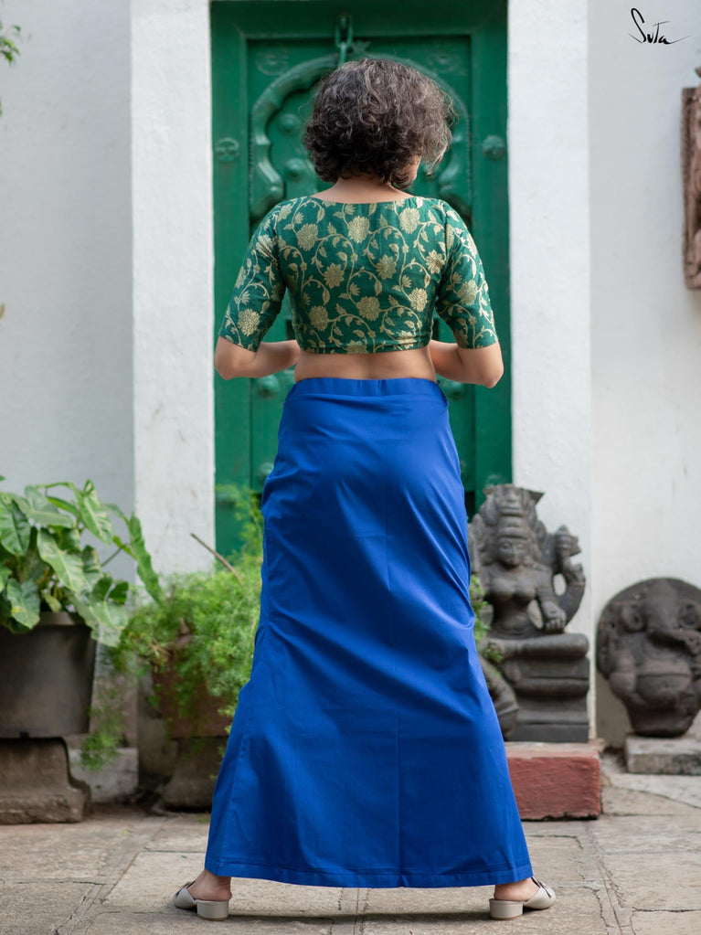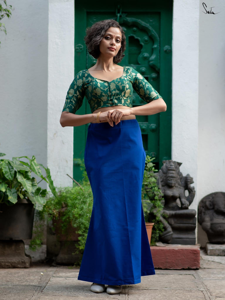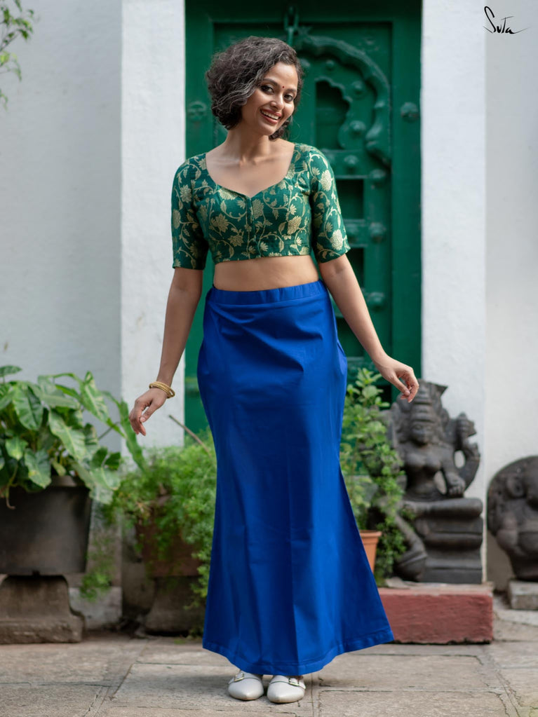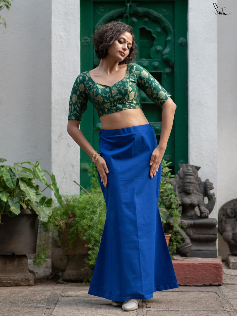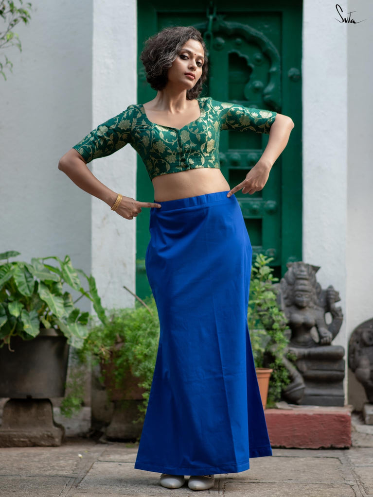Get ready to have the perfect drapes with Cobalt Gills, an underskirt that will illuminates your wardrobe! Crafted in blue, the cotton lycra underskirt ensures optimum stretchability. Cobalt Gills is a must-have essential for every stylish woman who desires a flawless drape, unparalleled comfort, and a dash of sophistication.