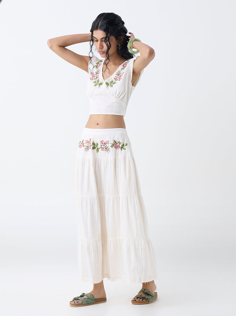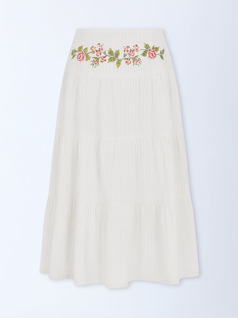 Bombay Paisley Off-White Floral Embroidered Tiered Skirt