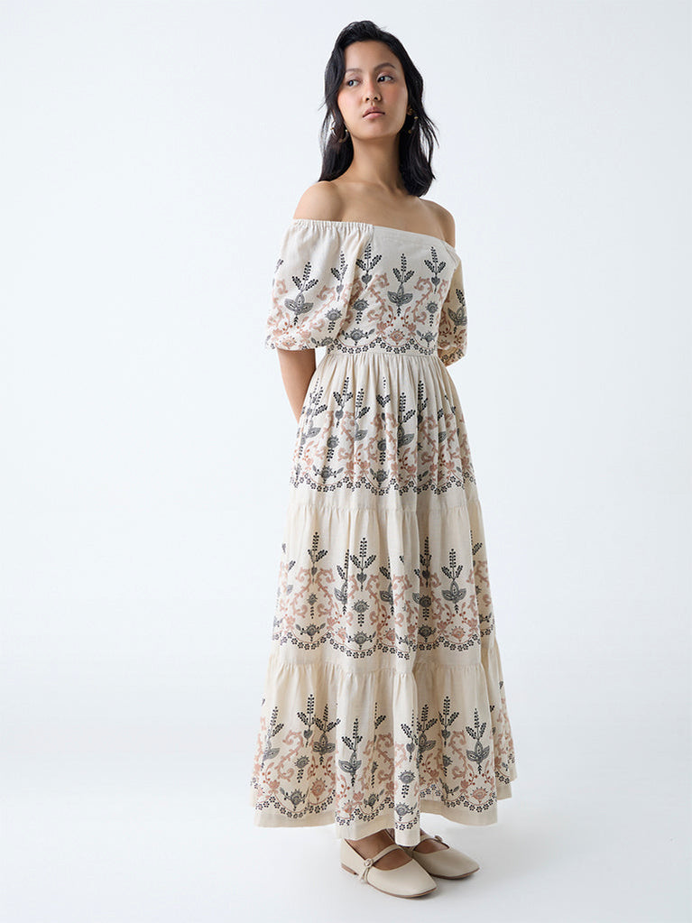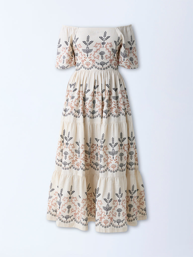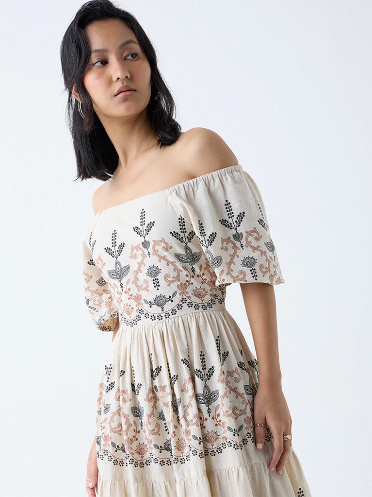 Bombay Paisley Off-White Foliage Cotton Off-Shoulder Dress