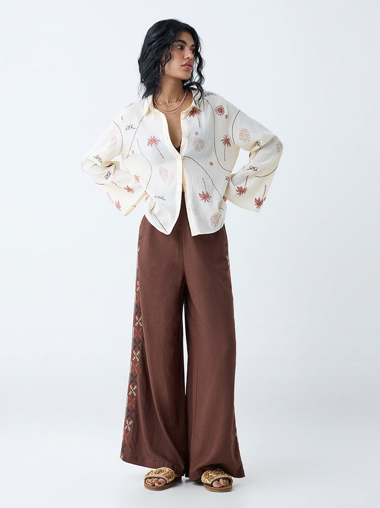 Bombay Paisley Off-White Wide-Leg Cotton Pants with Belt