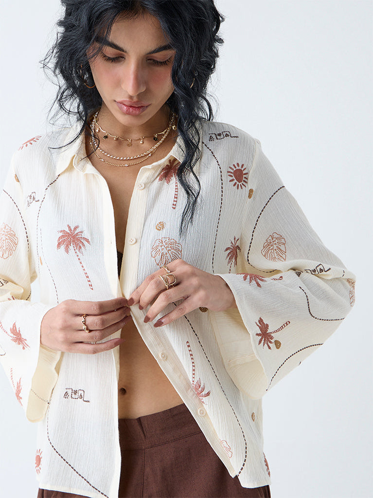 This off-white shirt from Bombay Paisley is embroidered with floral motifs on a soft crinkle-textured layer. The spread collar and bell sleeves add a hint of retro polish, while the button-up front keeps it contemporary. Cut from cotton-rich fabric with a gentle drape, it’s that perfect piece for warm days that call for light textures and thoughtful detail.