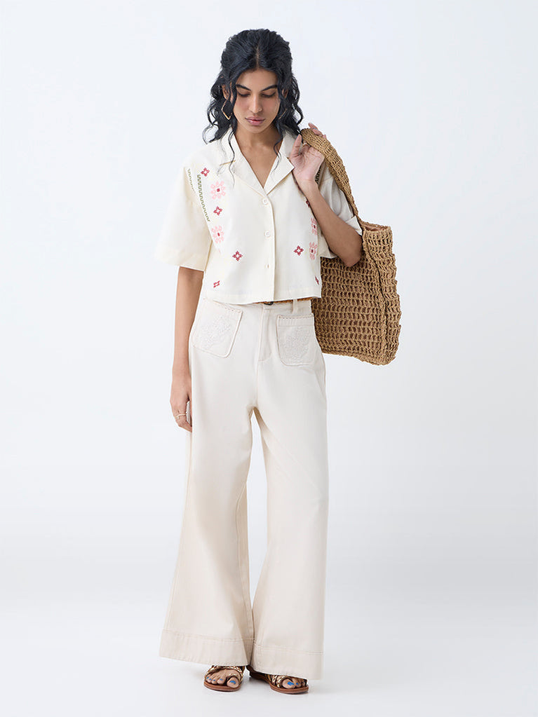 Infuse your day with breezy sophistication in these wide-leg off-white pants by Bombay Paisley. Crafted from pure cotton, they feature belt loops, a button closure, and a zipper placket for a structured yet relaxed fit. The front pockets highlight tonal floral embroidery, adding a subtle touch of artistry, while the braided belt completes the look.