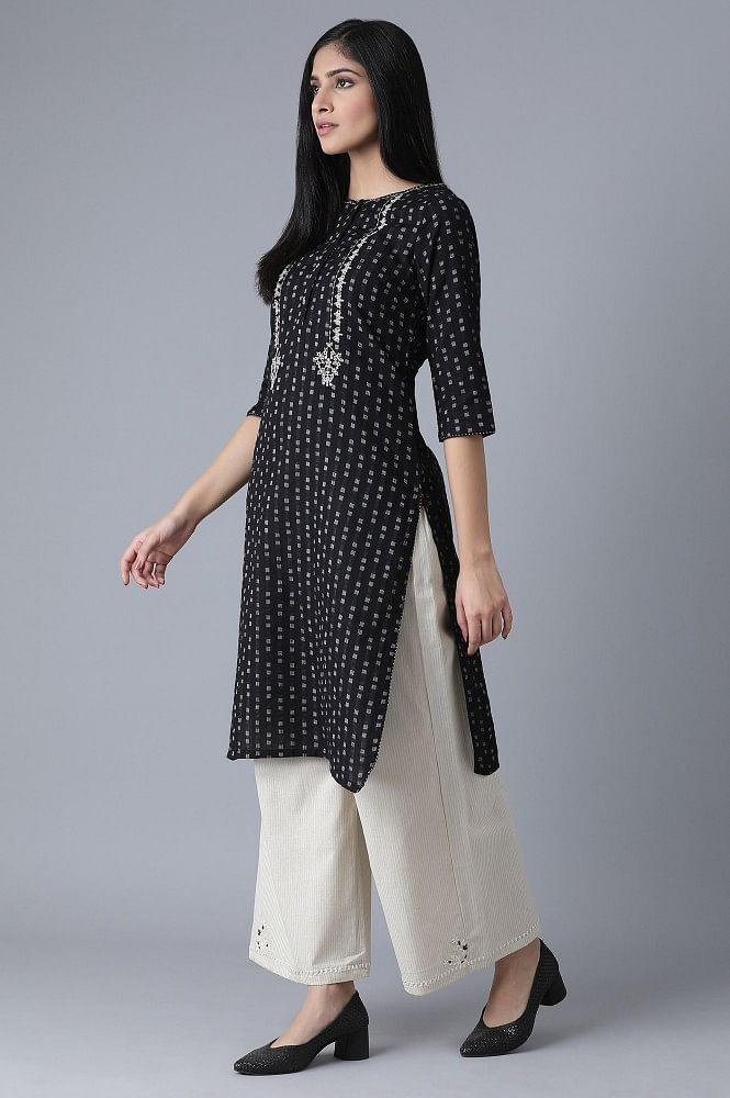 This black and off-white round neck 3/4 sleeve kurta has printed and embellished detail, a button with keyhole detail on the back and side slits.