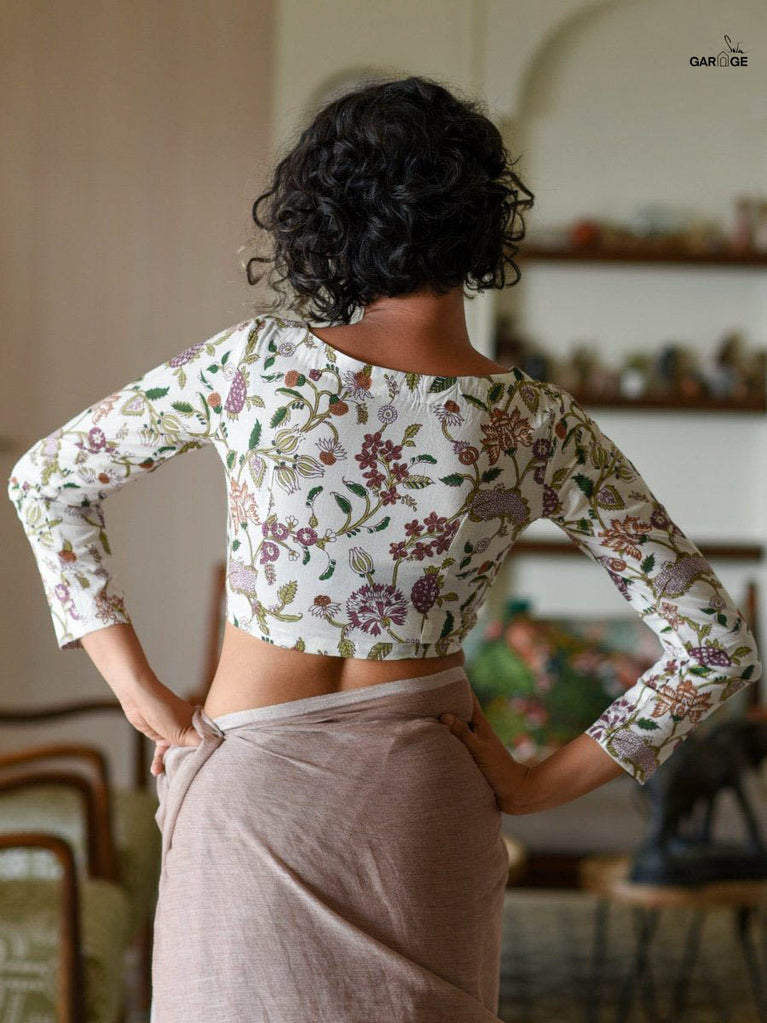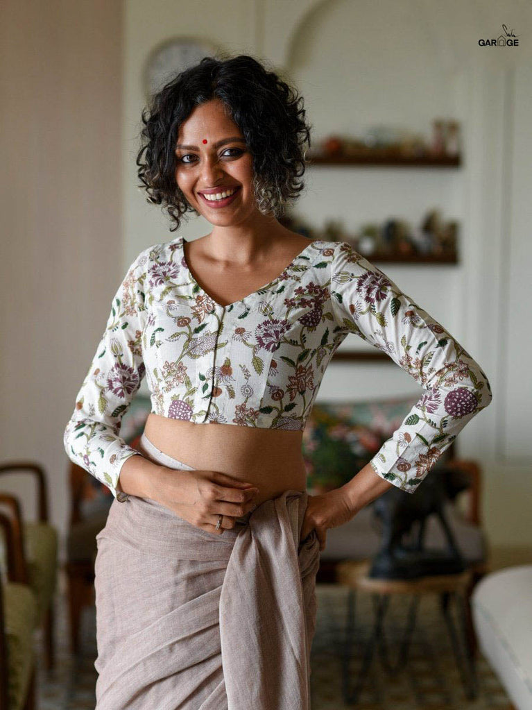 Blouse: The model is wearing XS size blouse called Maroon Curls