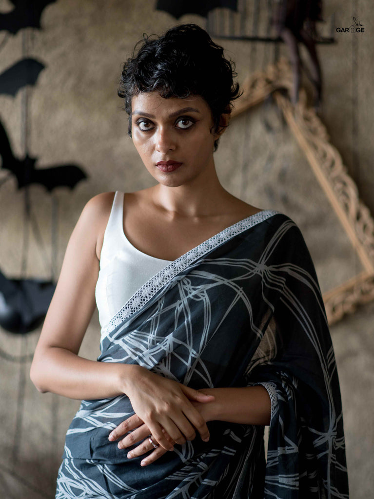 Su, the model is wearing size S blouse and the sarees are Cobweb, Reindeer