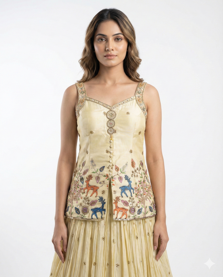 Crafted in delicate tissue fabric, this lehenga features fine hand thread embroidery along the border and on the top, creating a refined and graceful look. Lightweight yet elegant, the ensemble is perfect for festive occasions, intimate weddings, and traditional celebrations.
