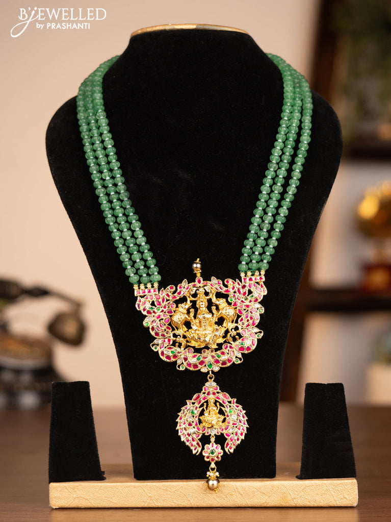 Antique beaded green necklace lakshmi pendant with jadau kundan stones and golden beads hanging without earrings