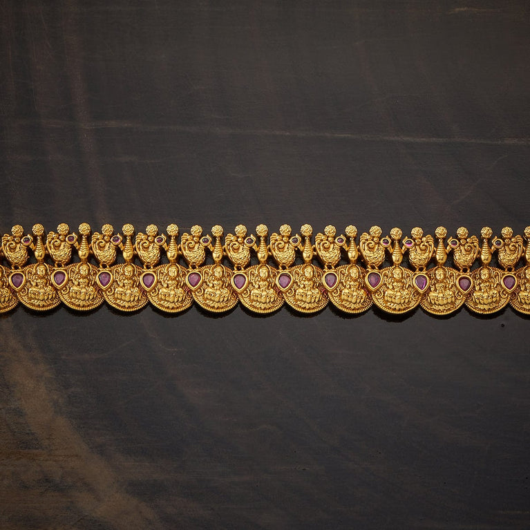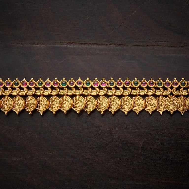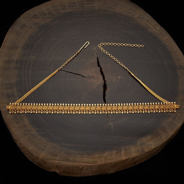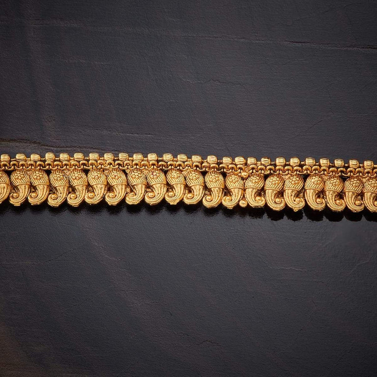 Kushal's Fashion Jewellery Leaf Pattern Antique BeltAccentuate your traditional outfit with the Antique Belt. Intricately designed from a copper alloy and embellished with synthetic stones, it’s a blend of elegance and craftsmanship. The gold polish highlights its rich design. At 70 cm, it gracefully encircles the waist, and its adjustable chain ensures it complements every silhouette perfectly.