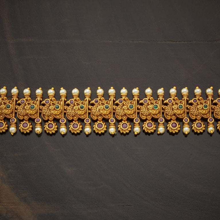Kushal's Fashion Jewellery Peacock Motif Antique BeltClassic fashion will always remain incomplete without antique belts. These belts are made of distinguished copper alloy and synthetic stones (only ruby colour). The stones enhance its beauty, while the copper alloy ensures sturdiness. This product comes with stunning gold polishing to elevate your traditional fashion at any event.