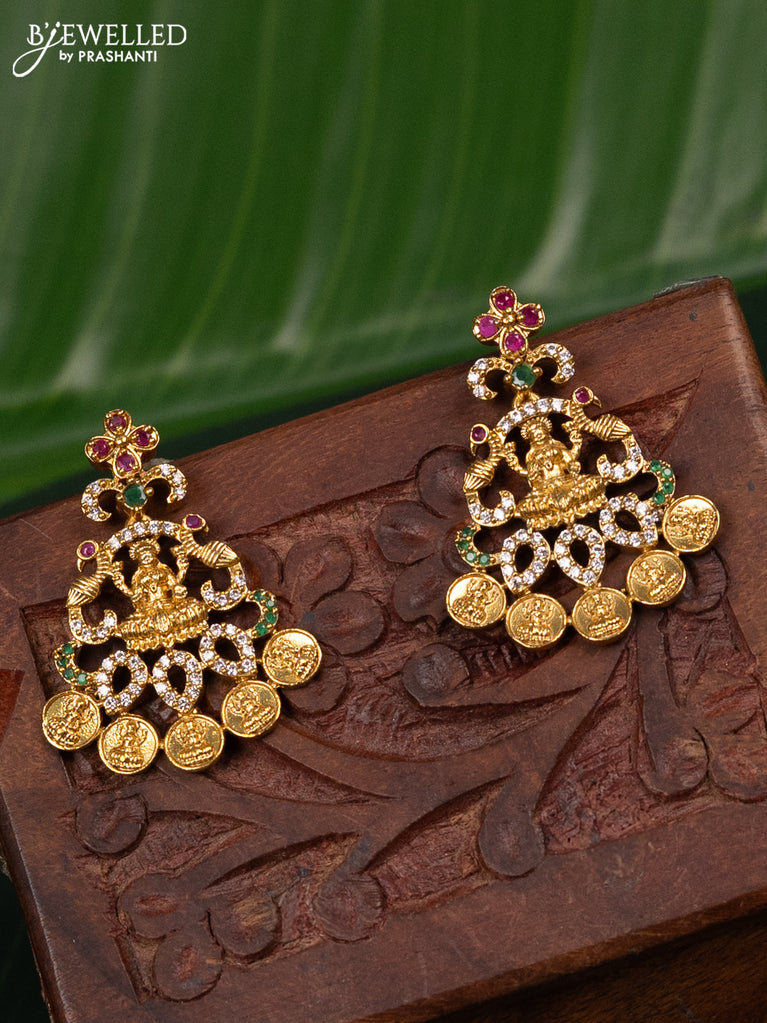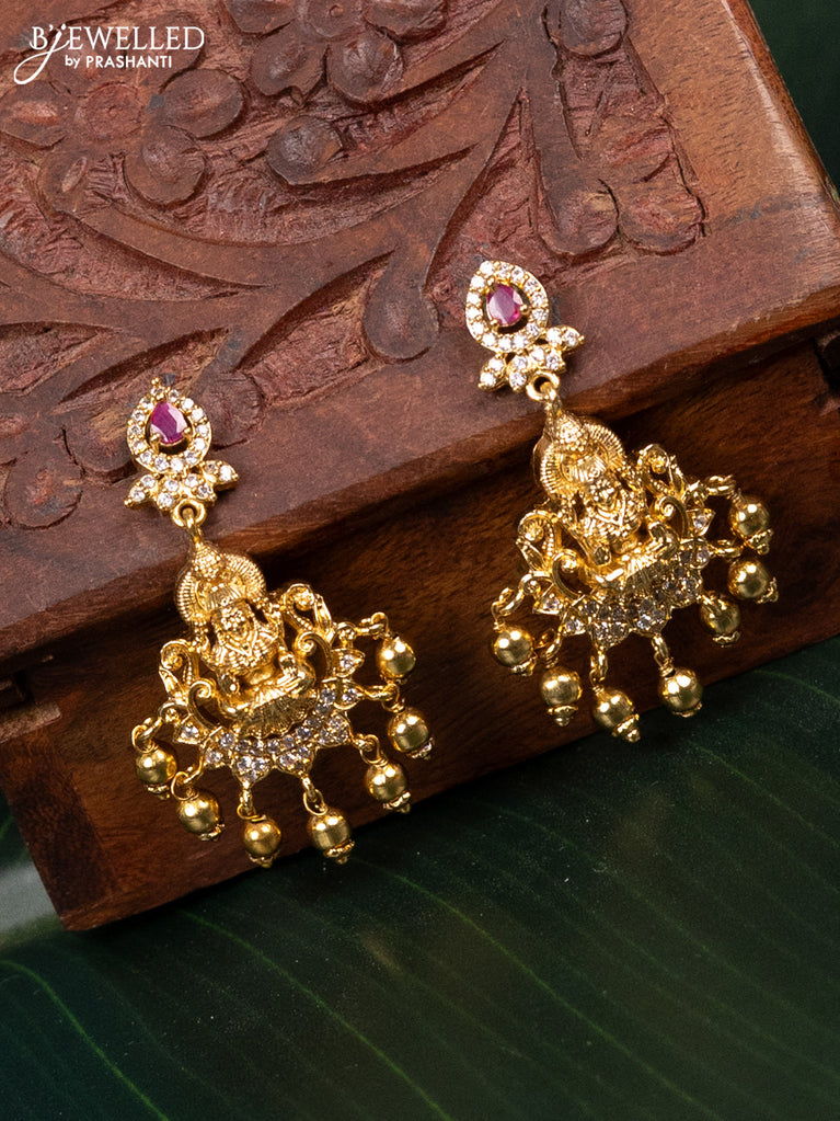 Antique earring lakshmi design with kemp & cz stones and golden beads hanging