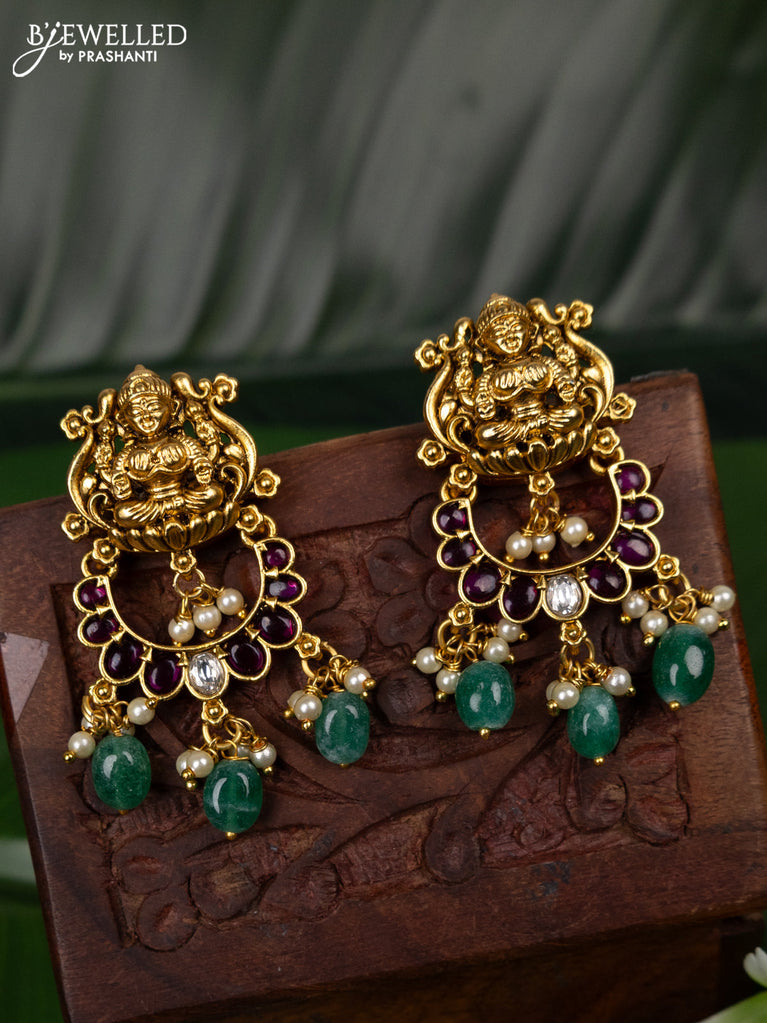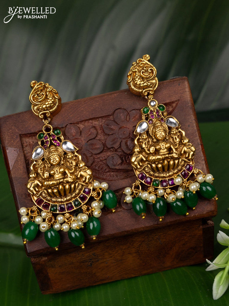 Antique earring lakshmi design with kemp & kundan stones and pearl & green beads hanging