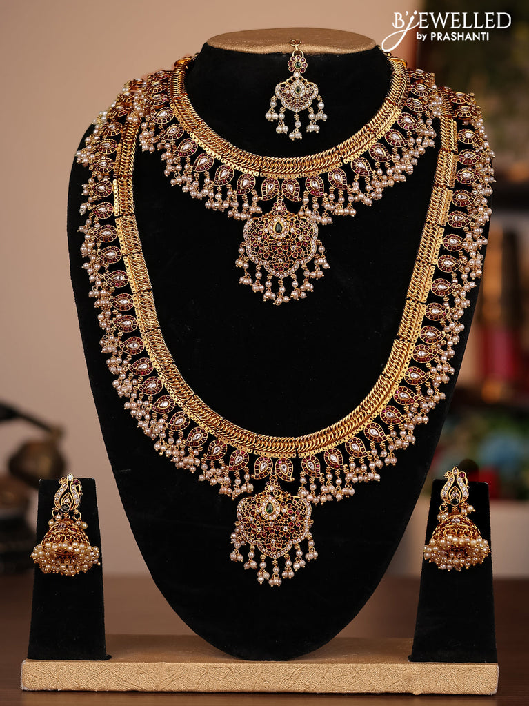 Antique guttapusalu combo set manga pattern with jadau kundan stones and pearl hangings
