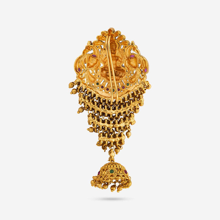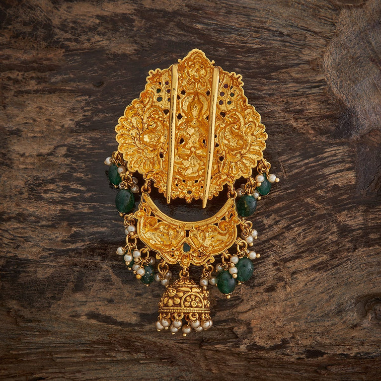 Antique hair clip big size krishna design with kemp stones and golden beads hanging