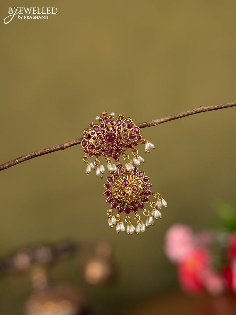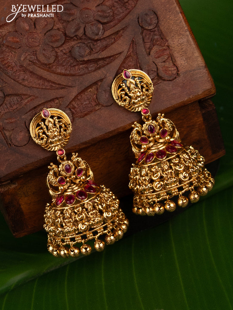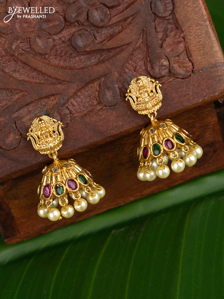Antique jhumka lakshmi design with kemp stones and pearl hangings