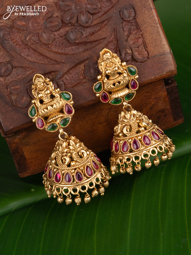 Antique jhumka lakshmi design with kemp stones and golden beads hanging