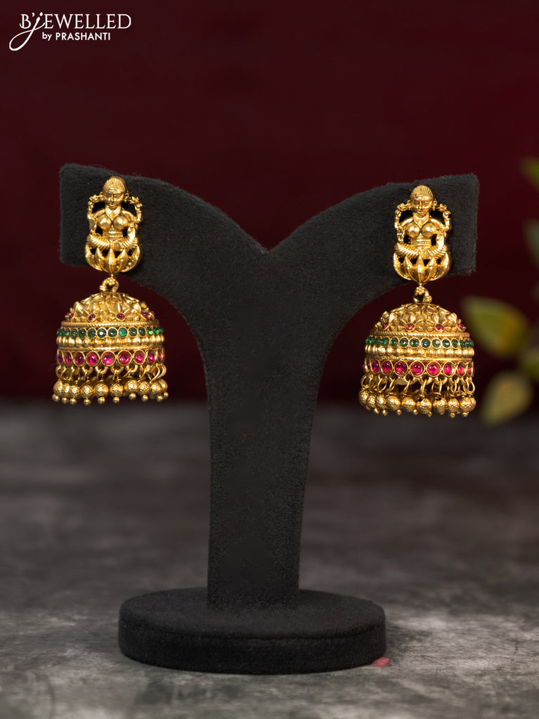 Antique jhumka lakshmi design with kemp stones and golden beads hangings
