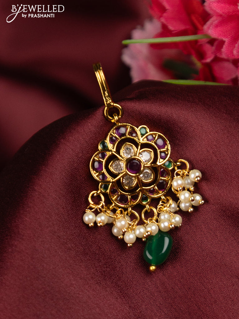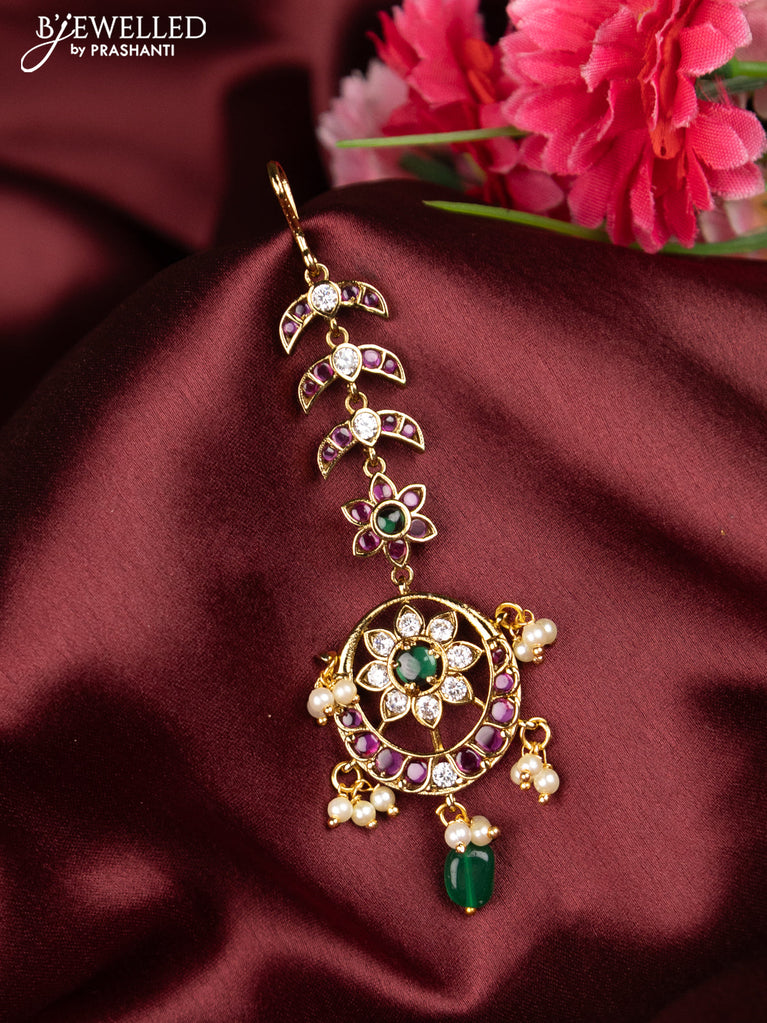 Antique maang tikka floral design with kemp & cz stones and pearl hangings