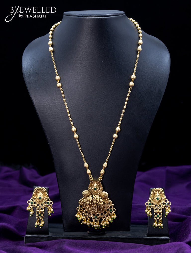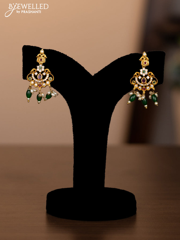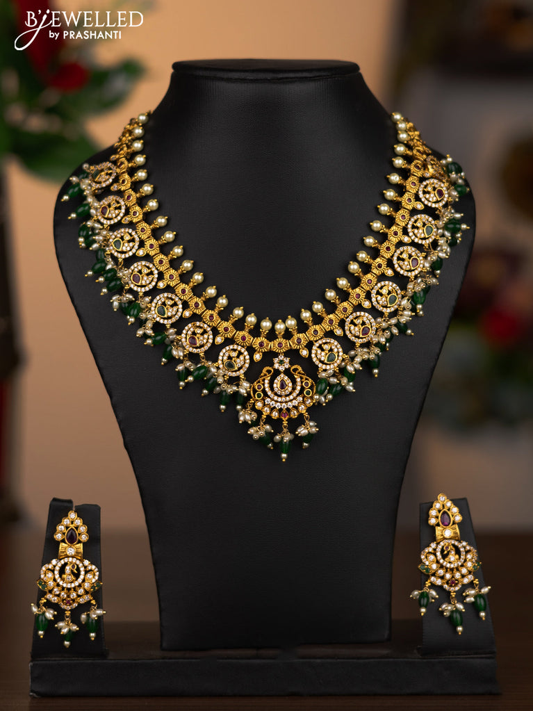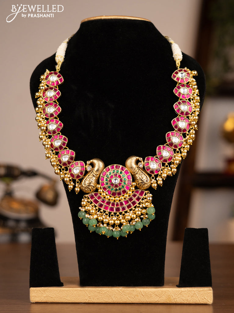 Antique necklace peacock design with kemp & cz stones and pearl & green beads hanging without earrings