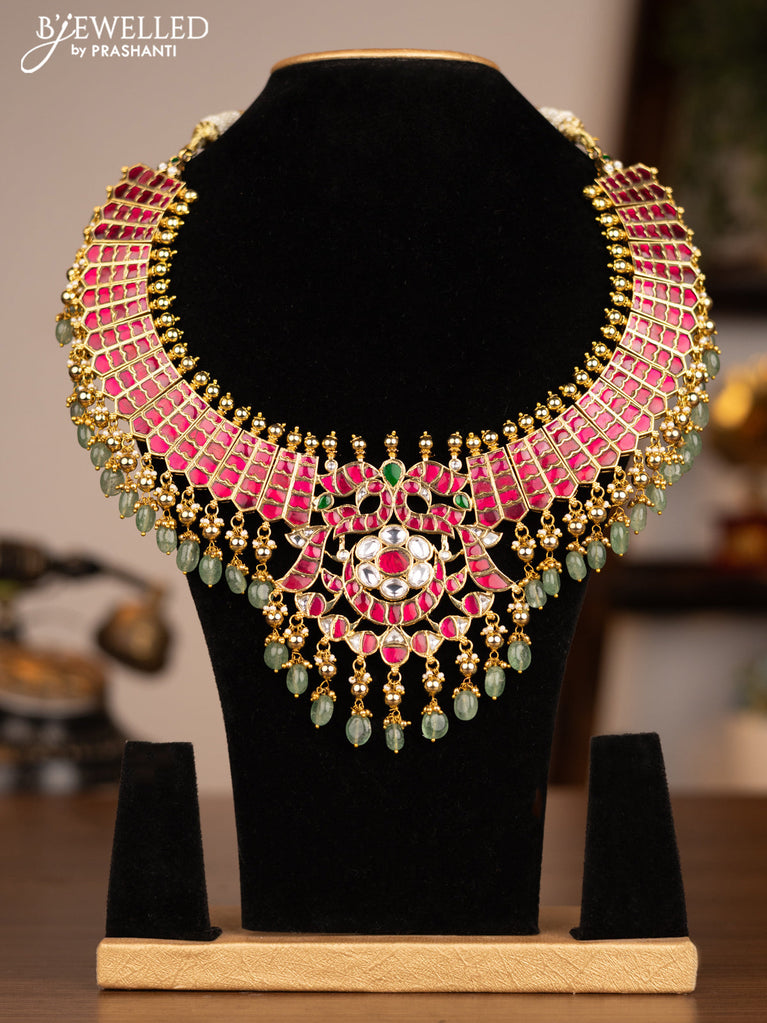 Antique necklace ramdarbar design with pink kemp & cz stones and pearl & beads hanging