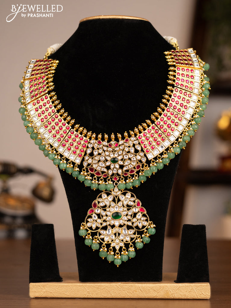 Antique necklace with jadau kundan stones and green beads & golden beads hanging without earrings