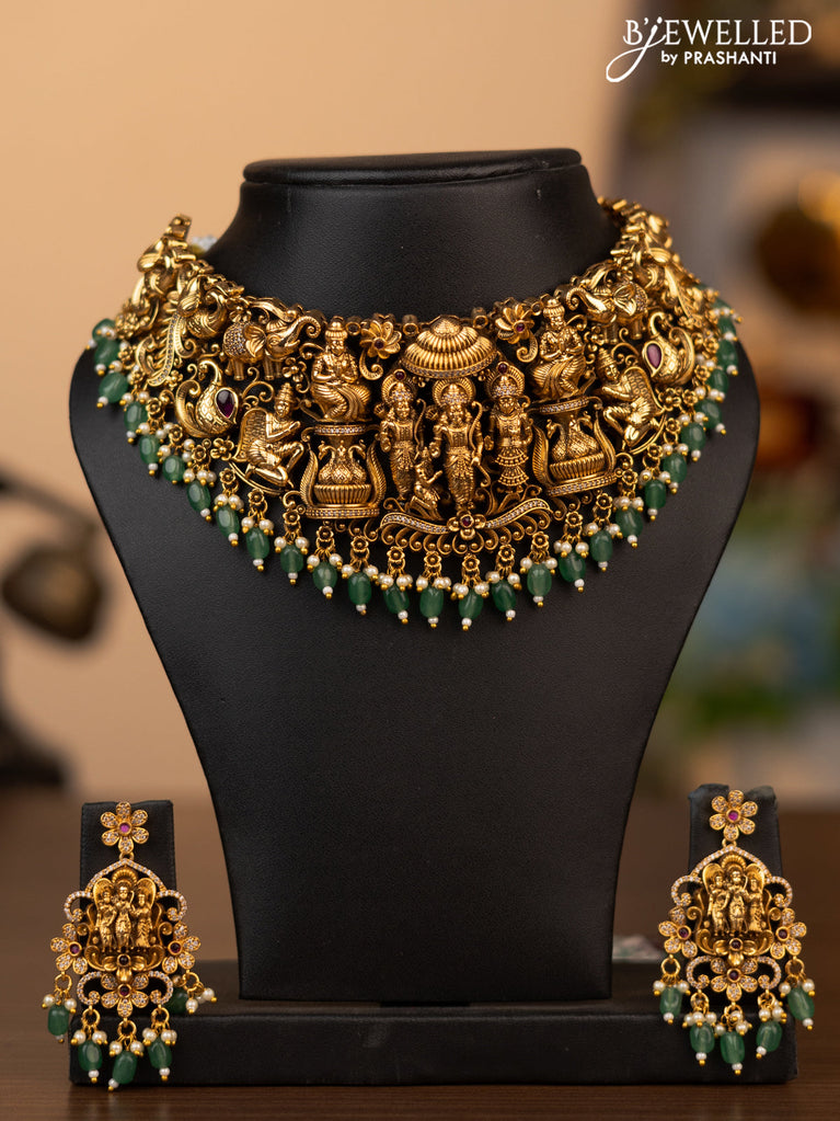 Antique necklace ramdarbar design with kemp & cz stones and pearl hangings