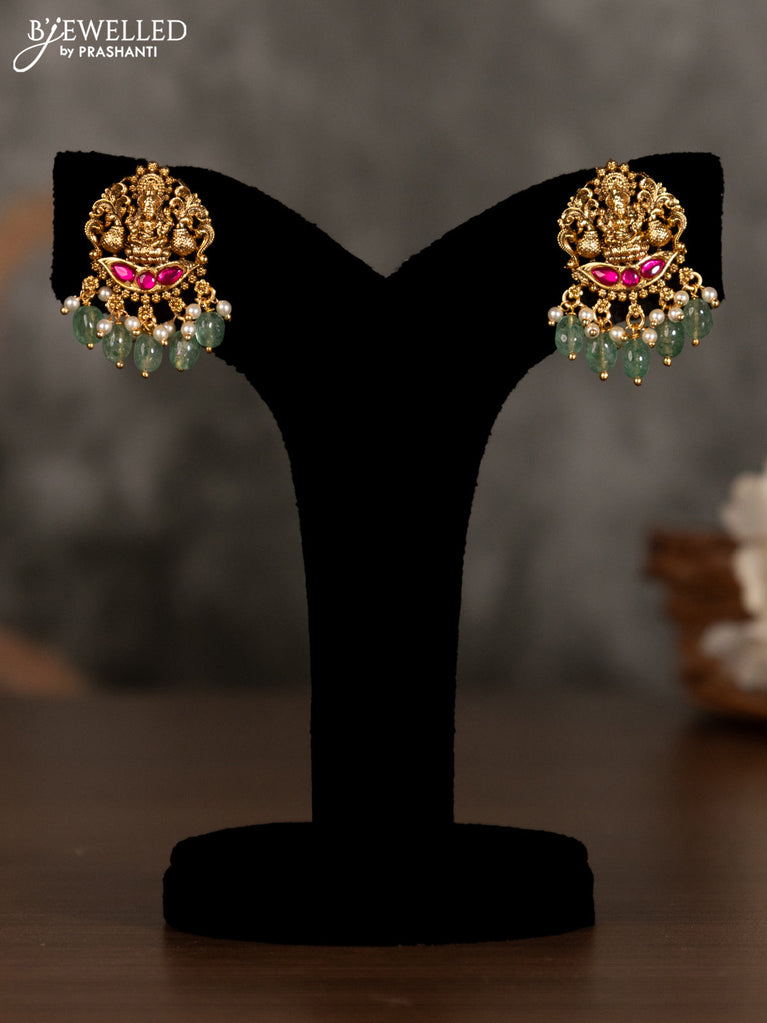 Antique pendant set lakshmi design with pink kemp stones and green beads hanging